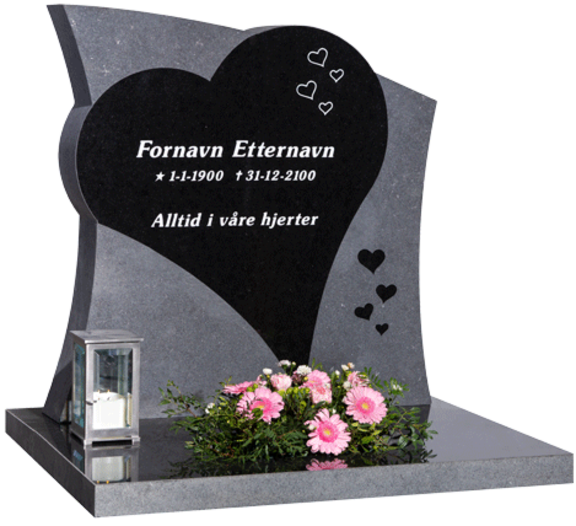 Unik gravstein i sort granitt. Polerte hjerter mot sandblåst bakgrunn gir denne steinen fine kontraster. Steinen har saget kant og bakside.