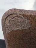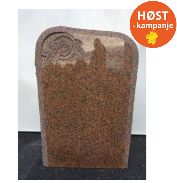 En unik gravstein med håndhugget dekor øverst til venstre i topp. Gravsteinen har polert front, med hugget kant og flammet bakside for ekstra særpreg. Den polerte fronten gjør den enkel å rengjøre.