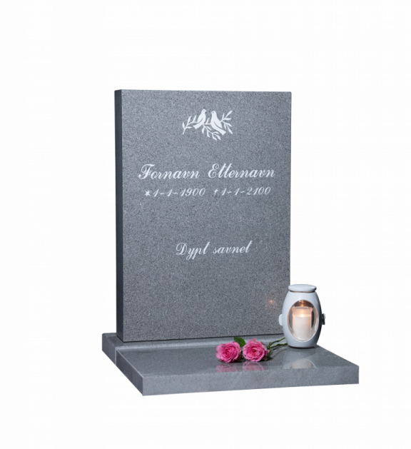 En tidløs gravstein med en klassisk, enkel utforming. Den rektangulære formen lar deg gjøre den mer personlig med dekor, som spurver eller lykter. Gravsteinen har polert front, saget kant og bakside.
