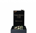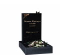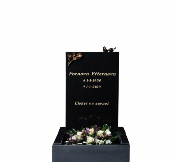Vises i sort granitt med skrifttype Souvenir i 22k bladgull. Bedramme. Pyntet med bronserose P-29351 og spurver i bronse. Tilbehøret er valgfritt og kan endres etter eget ønske.