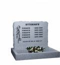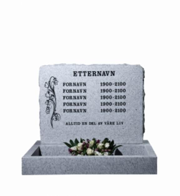 En tidløs gravstein med særpreg. Den leveres med hugget kant, flammet front og bakside, som fremhever steinsortens opprinnelige og naturlige preg. Grunnet steinens store overflate egner den seg meget godt til familiegravsteder.
