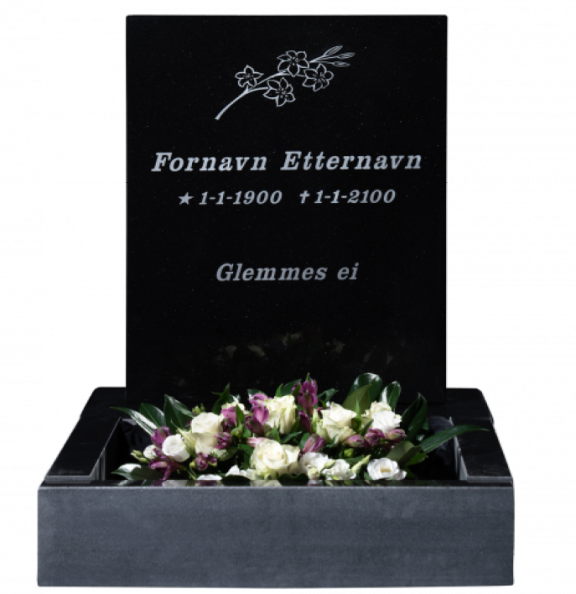 Pris som avbildet kr 13 500,- Vises i sort granitt med skrifttype køln i sølv lakk. Bedramme. Gravert dekor GD7. Tilbehøret er valgfritt og kan endres etter eget ønske.