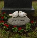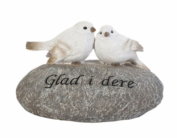 Søt dekor, to fugler sittende på en stein, med teksten "Glad i dere"